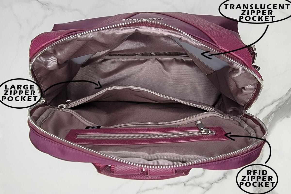 Image: The RFID compartment, anti-theft lock, and secret pocket of the V-Style bag.