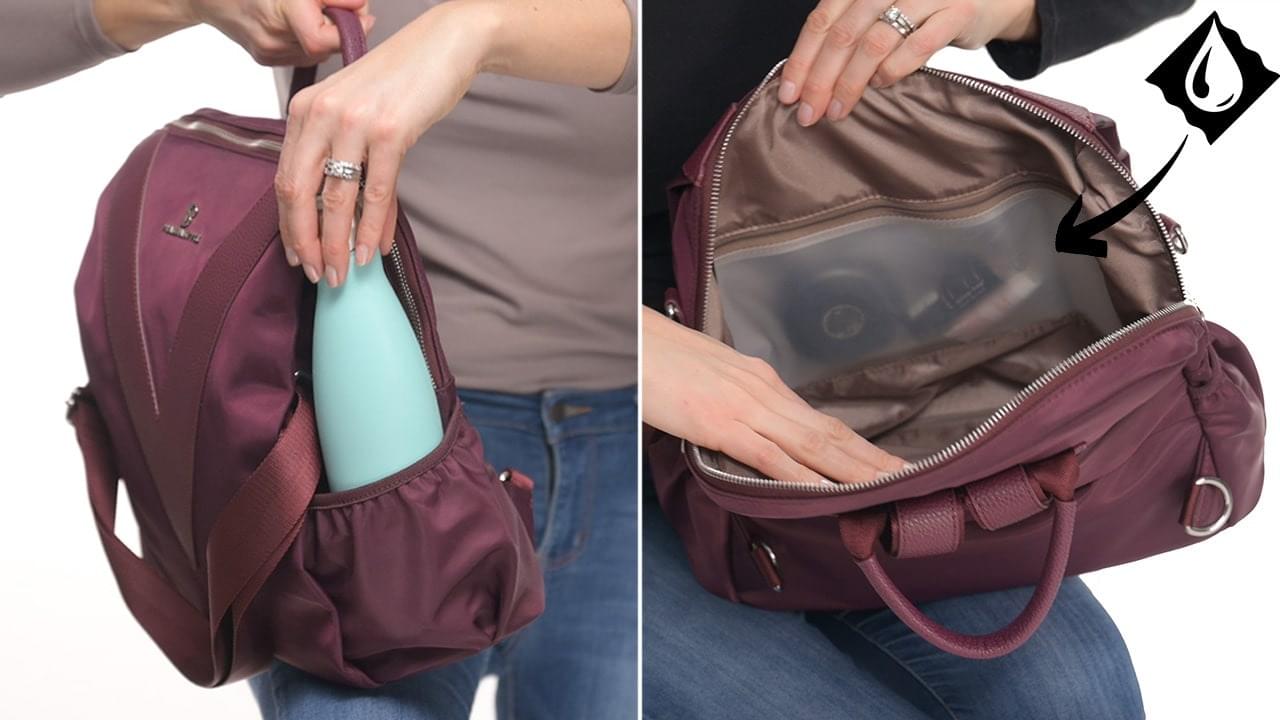HOW: The V-Style bag holds a 13-inch laptop. It also features adjustable storage space with elastic for a bottle on both sides. Its interior compartment has three zippered pockets, including one of which is translucent over the entire width of the bag, allowing you to see what is stored at a glance.